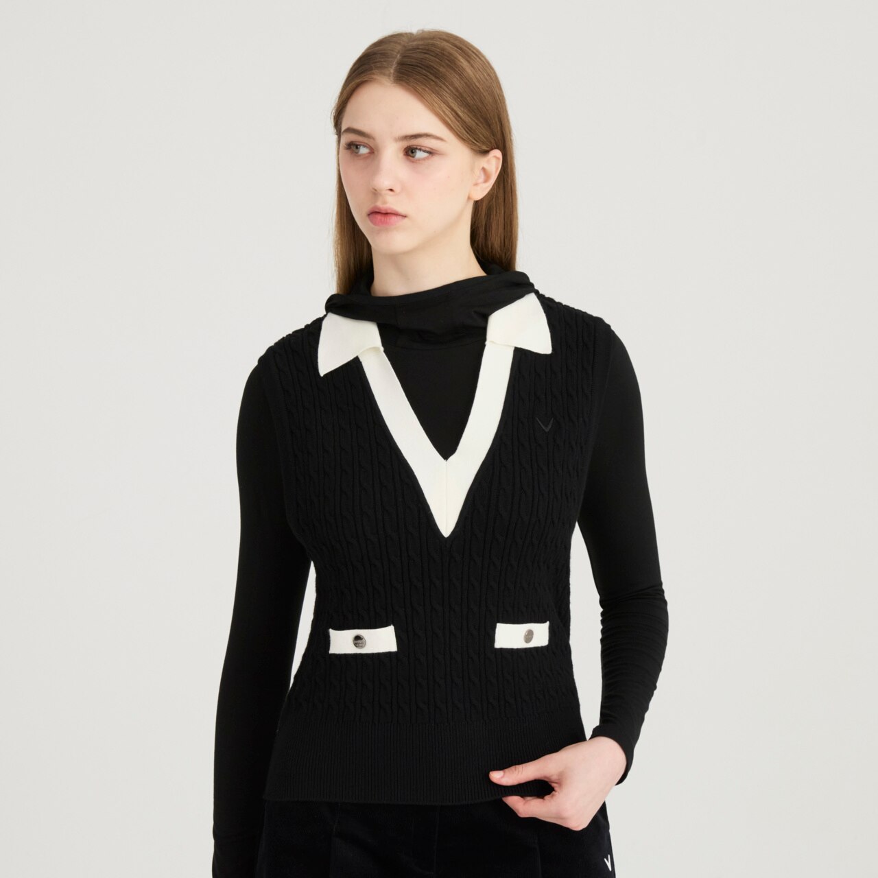 변형 에리 디자인에 케이블 조직으로 편직한 제품으로 레이어드 코디가 가능합니다.